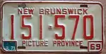 1969–71 | Embossed red serial on reflective white plate; border lines around plate and around bottom corners; "NEW BRUNSWICK" centred at top; "69" at bottom right | "PICTURE PROVINCE" centred at bottom | 123-456 | 1-000 to approximately 239-000 | |