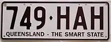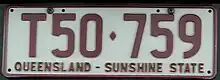 The Australian state of Queensland requires its residents to register their motor vehicles and display vehicle registration plates.[1] Current regular issue plates are to the standard Australian dimensions of 372 mm (14.6 in) in length by 134 mm (5.3 in) in height, and use standard Australian serial dies.[2]