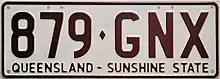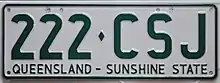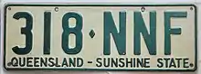 Once the aaa·nnn format between NAA·000 and PZZ·999 was exhausted, Queensland reversed the order to nnn·aaa, starting 1 July 1977.[6] These plates were issued with green text on a white reflective background and bore the slogan Queensland – Sunshine State.[6] As such Queensland became the second jurisdiction in Australia to issue sloganised plates.[6] This series started at 000·NAA and spanned through to 999·PZZ.[7] After exhausting this initial allocation, in late 1987, Queensland began issuing combinations from 000·AAA onwards.