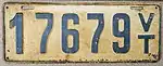 1917 | Embossed blue serial on white plate with border line; vertical "VT" at right | none | 12345 | 1 to approximately 20300 | |