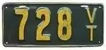 1918 | Embossed golden yellow serial on green plate with border line; vertical "VT" at right | none | 12345 | 1 to approximately 22500 | |