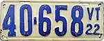 1922 | Embossed blue serial on white plate; "VT 22" at right | none | 12-345 | 1 to approximately 42-000 | |