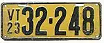 1923 | Embossed black serial on yellow plate with border line; "VT 23" at left | none | 12-345 | 100 to approximately 48-000 | |