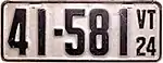 1924 | Embossed black serial on silver plate with border line; "VT 24" at right | none | 12-345 | 100 to approximately 57-000 | |