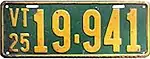 1925 | Embossed golden yellow serial on green plate with border line; "VT 25" at left | none | 12-345 | 100 to approximately 64-000 | |