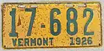 1926 | Embossed green serial on golden yellow plate with border line; "VERMONT 1926" at bottom | none | 12-345 | 1 to approximately 69-000 | |