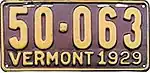 1929 | Embossed tan serial on maroon plate with border line; "VERMONT 1929" at bottom | none | 12-345 | 1 to approximately 85-000 | |