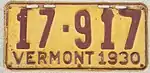 1930 | Embossed maroon serial on tan plate with border line; "VERMONT 1930" at bottom | none | 12-345 | 1 to approximately 85-000 | |