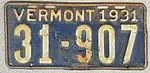 1931 | Embossed white serial on dark blue plate with border line; "VERMONT 1931" at top | none | 12-345 | 1 to approximately 76-000 | |