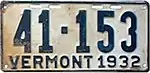 1932 | Embossed dark blue serial on white plate with border line; "VERMONT 1932" at bottom | none | 12-345 | 1 to approximately 70-000 | |