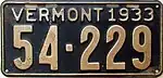 1933 | Embossed white serial on dark blue plate with border line; "VERMONT 1933" at top | none | 12-345 | 101 to approximately 69-000 | |