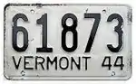 1944 | Embossed black serial on white plate; "VERMONT 44" at bottom | none | 12345 | 1 to approximately 74000 | |