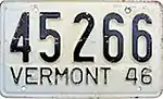 1946 | Embossed black serial on white plate; "VERMONT 46" at bottom | none | 12345 | 1 to approximately 88000 | |