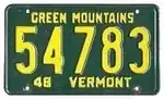 1948 | Embossed gold serial on dark green plate; "48 VERMONT" centered at bottom | "GREEN MOUNTAINS" centered at top | 12345 | 1 to approximately 96000 | Most recent passenger base to use a color other than green or white. |