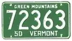 1950 | Embossed white serial on dark green plate with border line; "50 VERMONT" centered at bottom | "GREEN MOUNTAINS" centered at top | 12345 | 1 to 99999 | |