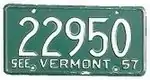 1957 | Embossed white serial on dark green plate; "VERMONT" centered at bottom; "57" at bottom right | "SEE" to left of state name, giving "SEE VERMONT" | 12345 | 1 to 99999 | First 6" x 12" plate. |