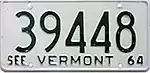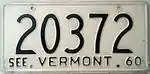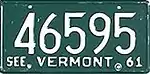 1958 | Embossed dark green serial on white plate; "VERMONT" centered at bottom; "58" at bottom right | "SEE" to left of state name, giving "SEE VERMONT" | 12345 | 1 to 99999 | |