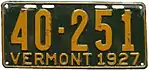 1927 | Embossed golden yellow serial on green plate with border line; "VERMONT 1927" at bottom | none | 12-345 | 1 to approximately 75-000 | |
