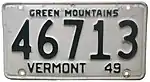 1949 | Embossed dark green serial on white plate; "VERMONT 49" centered at bottom | "GREEN MOUNTAINS" centered at top | 12345 | 1 to approximately 99000 | |