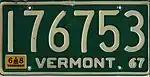 1967–68 | Debossed white serial on green plate with border line; "VERMONT" centered at bottom; rectangular sticker box at bottom left and "67" at bottom right | none | 123456 | 1 to approximately 187000 |