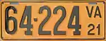 1921 Embossed black serial on orange plate with border line; "VA 21" at right 123-456 1 to approximately 146-000