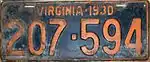 1930 Embossed orange serial on black plate with border line; "VIRGINIA · 1930" centered at top 123-456 1 to approximately 349-000