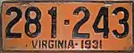 1931 Embossed black serial on orange plate with border line; "VIRGINIA · 1931" centered at bottom 123-456 1 to approximately 368-000