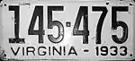 1933 Embossed black serial on white plate; "VIRGINIA - 1933" at bottom 123-456 1 to approximately 334-000