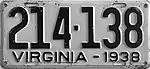 1938 Embossed black serial on white plate; "VIRGINIA - 1938" at bottom 123-456 1 to approximately 388-000