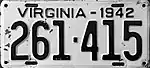 1942–43 Embossed black serial on white plate; "VIRGINIA - 1942" at top 123-456 1 to approximately 524-000 Revalidated for 1943 with black tabs, due to metal conservation for World War II.