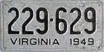 1949 Embossed black serial on unpainted aluminum plate; "VIRGINIA 1949" at bottom 123-456 1 to approximately 698-000