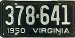 1950 Embossed white serial on black plate; "1950 VIRGINIA" at bottom 123-456 1 to approximately 783-000