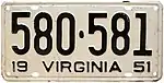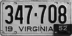 1951–52 Embossed black serial on white plate; "19 VIRGINIA 51" at bottom 123-456 1 to 999-999 Revalidated for 1952 with black tabs, due to metal conservation for the Korean War.[6] Plates with serials A100-000 and up used narrower serial dies; this practice continued until 1969.[7]