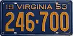 1953 Embossed orange serial on blue plate; "19 VIRGINIA 53" at top 123-456 1 to approximately 940-000
