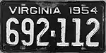 1954 Embossed white serial on black plate; "VIRGINIA 1954" at top 123-456 1 to approximately 999-999
