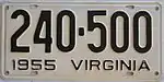 1955 Embossed black serial on white plate; "1955 VIRGINIA" at bottom 123-456 1 to 999-999