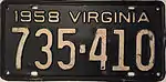 1958 Embossed white serial on black plate; "1958 VIRGINIA" at top 123-456 1 to 999-999