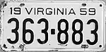 1959 Embossed black serial on white plate; "19 VIRGINIA 59" at top 123-456 1 to 999-999