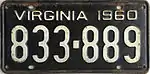 1960 Embossed white serial on black plate; "VIRGINIA 1960" at top 123-456 1 to 999-999