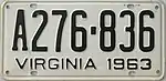 1963 Embossed black serial on white plate; "VIRGINIA 1963" at bottom 123-456 1 to 999-999