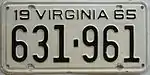1965 Embossed black serial on white plate; "19 VIRGINIA 65" at top 123-456 1 to 999-999