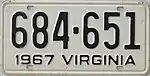 1967 Embossed black serial on white plate; "1967 VIRGINIA" at bottom 123-456 1 to 999-999