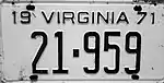 1971 Embossed black serial on white plate, with or without border line; "19 VIRGINIA 71" at top 123-456 1 to 999-999