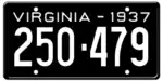 1937 Embossed white serial on black plate; "VIRGINIA - 1937" at top 123-456 1 to approximately 375-000