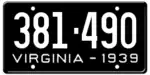 1939 Embossed white serial on black plate; "VIRGINIA - 1939" at bottom 123-456 1 to approximately 402-000