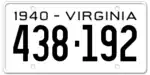 1940 Embossed black serial on white plate; "1940 - VIRGINIA" at top 123-456 1 to approximately 438-000
