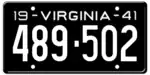 1941 Embossed white serial on black plate; "19 - VIRGINIA - 41" at top 123-456 1 to approximately 491-000