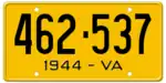 1944 Embossed black serial on yellow plate; "1944 - VA" centered at bottom 123-456 1 to approximately 468-000