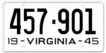 1945 Embossed black serial on white plate; "19 - VIRGINIA - 45" at bottom 123-456 1 to approximately 475-000