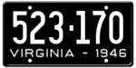 1946 Embossed white serial on black plate; "VIRGINIA - 1946" at bottom 123-456 1 to approximately 524-000